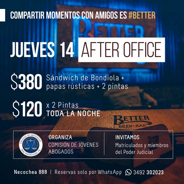 After office, jueves 14 de junio. Organiza Comisión de Jóvenes Abogados.