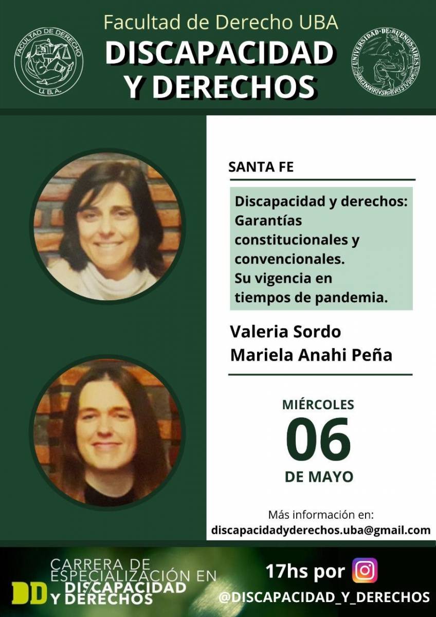 Mañana, miércoles 06, a las 17 horas tendrá lugar el segundo encuentro del Ciclo de Charlas sobre «Discapacidad y Derechos» organizado por la Facultad de Derecho de la UBA. En esta oportunidad, Valeria Sordo y Mariela Peña expondrán sobre «DISCAPACIDAD Y DERECHOS. GARANTIAS CONSTITUCIONALES Y CONVENCIONALES. SU VIGENCIA EN TIEMPOS DE PANDEMIA». La charla podrá visualizarse por IG @DISCAPACIDAD_Y_DERECHOS