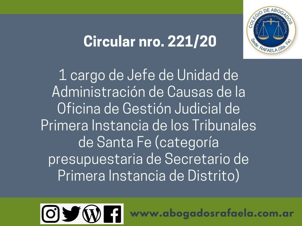 Circular nro. 221. 1 cargo de Jefe de Unidad de Administración de Causas de la Oficina de Gestión Judicial de Primera Instancia de los Tribunales de Santa Fe (categoría presupuestaria de Secretario de Primera Instancia de Distrito)