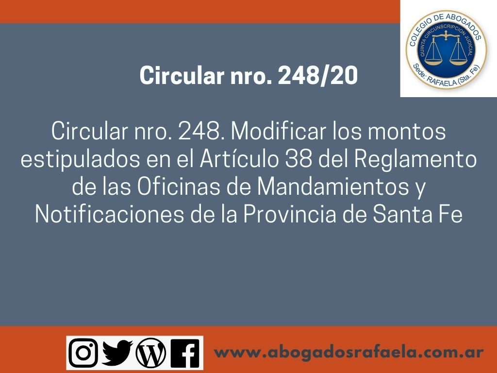 Circular nro. 248. Modificar los montos estipulados en el Artículo 38 del Reglamento de las Oficinas de Mandamientos y Notificaciones de la Provincia de Santa Fe.