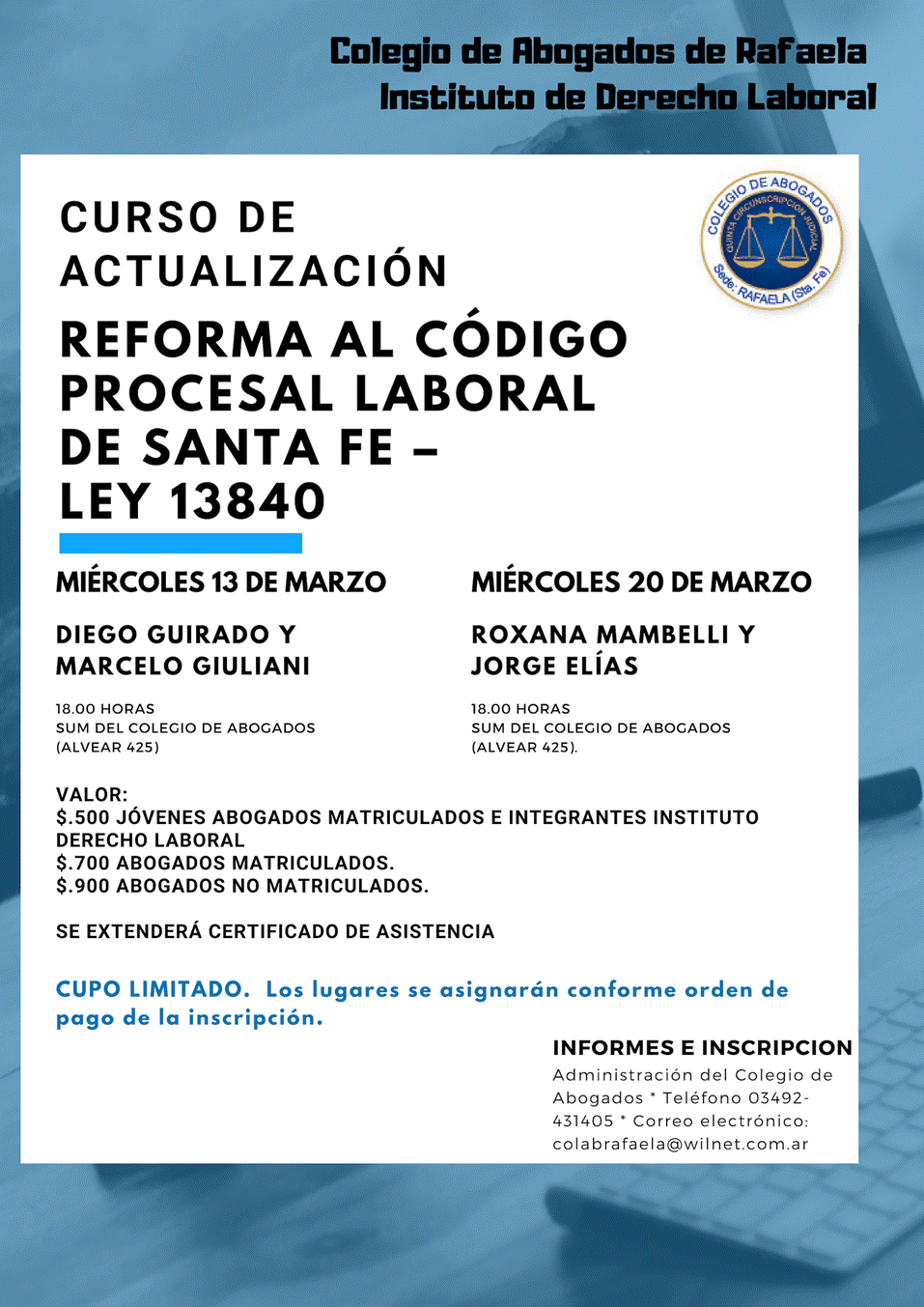 Se informa a los colegiados que esta institución, a través del Instituto de Derecho del Trabajo, tiene previsto organizar un Curso sobre Reforma al Código Procesal Laboral de Santa Fe (Ley 13.840) similar al que comenzará este miércoles 27 en la ciudad de Santa Fe.   En principio, se llevará a cabo en el SUM de este Colegio, los miércoles 13 y 20 de marzo próximos, desde las 17.00 hs. Estará a cargo de los Dres. Roxana Mambelli, Jorge Elías, Marcelo Giuliani y Diego Guirado.  Los costos serán de $.500 para jóvenes abogados o integrantes del Instituto y $.700 para abogados en general.