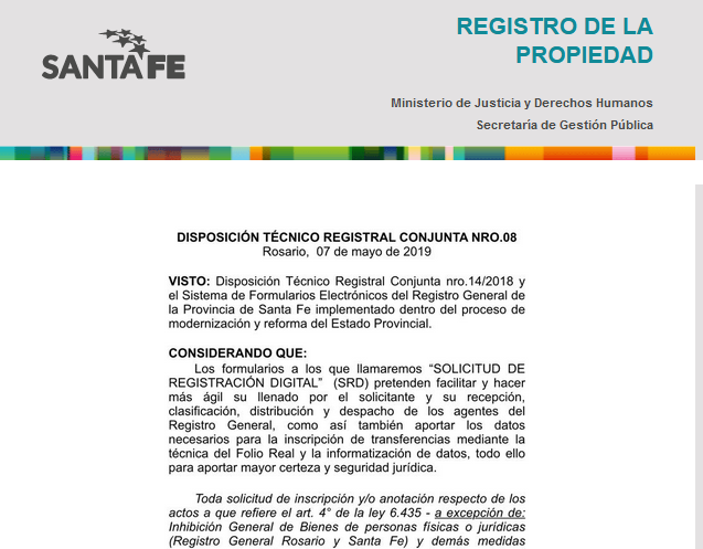 DISPOSICION TECNICO REGISTRAL CONJUNTA Nº 14/2018 – FORMULARIOS DE SOLICITUD DE REGISTRACION DIGITAL (SRD)