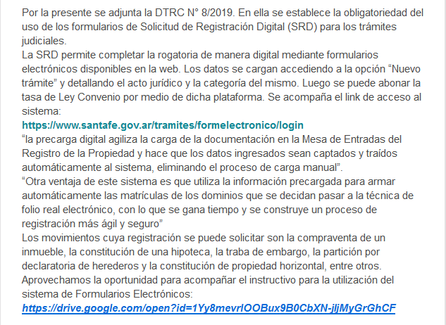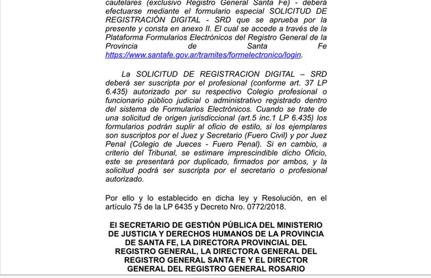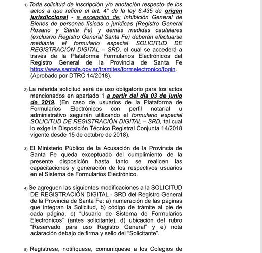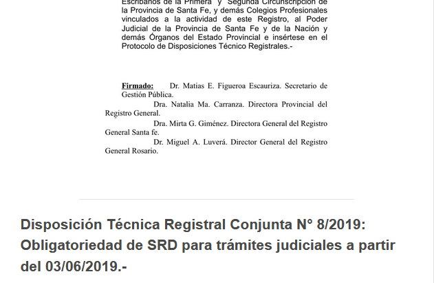 *Mesa de Ayudas SRD (Solicitud de Registración Digital) Tenemos el agrado de informarle que desde el dia de la fecha ya se encuentra en funcionamiento la Mesa de Ayudas para la plataforma de Formularios Electrónicos SRD del Registro General de la Provincia de Santa Fe. La misma cuenta con un horario de atención de 7.15 a 12.30hs. Telefonos de contacto: 0341-4721763/4/6 Interno 217 mails de consultas: srdrgros@santafe.gov.ar / srdrgsfe@santafe.gov.ar A continuación acompañamos el link para acceder a la pagina de FORMULARIOS ELECTRONICOS y realizar las rogaciones por SRD y dos videos explicativos del sistema. www.santafe.gov.ar/tramites/formelectronico/login TUTORIAL SRD: https://www.facebook.com/1579611239025397/videos/1968286320157885/ EXPLICATIVO SRD: https://www.facebook.com/1579611239025397/videos/1766145863705266/ «Esperamos que el presente le haya sido de utilidad, agradecemos el apoyo constante de todos nuestros colegas respecto a los cambios que estamos llevando a cabo. Sin otro particular. Saludo atte. Dr. Matías Figueroa Escauriza.